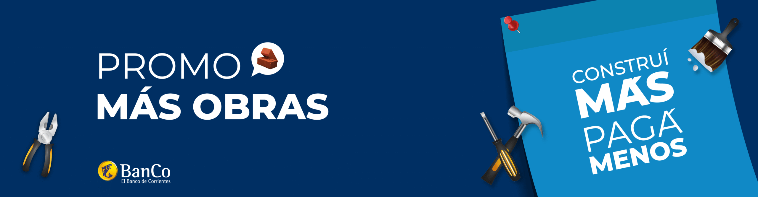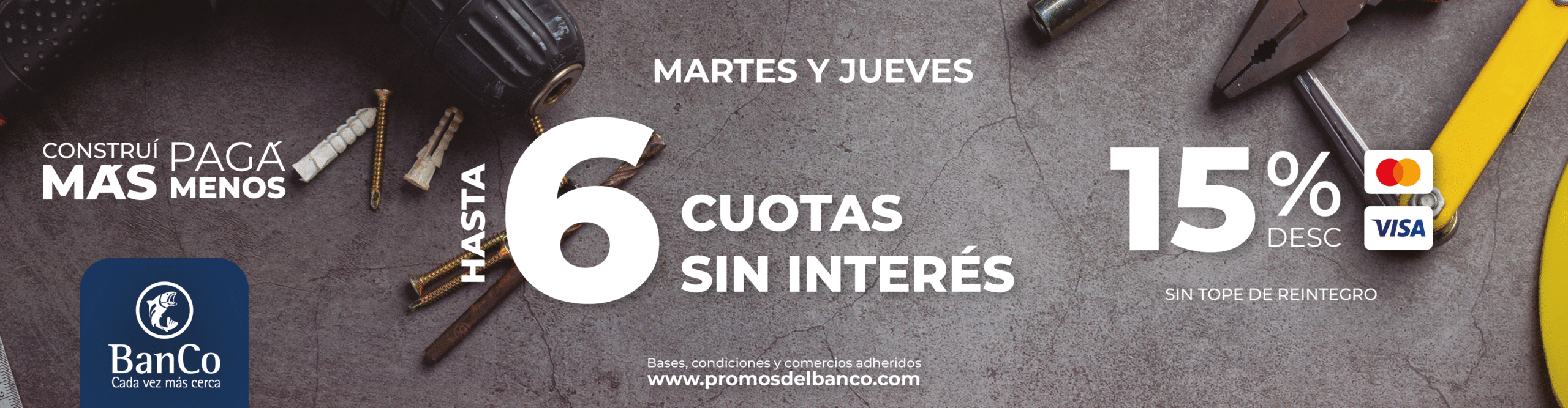 PROMOCIÓN VIGENTE LOS DIAS MARTES Y JUEVES PARA LAS COMPRAS DE MATERIALES DE LA CONSTRUCCIÓN, CON TARJETA DE CRÉDITO VISA Y MASTERCARD DEL BANCO DE CORRIENTES. SE BONIFICARÁ EL 15% (QUINCE POR CIENTO) SOBRE EL IMPORTE TOTAL DE LA COMPRA Y EN HASTA 6 (SEIS) CUOTAS SIN INTERÉS. CFTNA: 0%. COSTO FINANCIERO TOTAL NOMINAL ANUAL. TASA NOMINAL ANUAL 0,00%. TASA EFECTIVA ANUAL: 0,00%. EN TODOS LOS CASOS, LA BONIFICACIÓN SE VERA REFLEJADA COMO UN CRÉDITO EN EL PRIMER O SEGUNDO RESUMEN DE CUENTA (TARJETA DE CRÉDITO Y/O DE CUENTA BANCARIA DE ACUERDO A LO QUE CORRESPONDA) QUE SE EMITA CON POSTERIORIDAD A LA FECHA DE COMPRA. PROMOCIÓN NO ACUMULABLE CON OTRAS PROMOCIONES VIGENTES. PROMOCION SOLO VALIDA EN COMERCIOS ADHERIDOS Y EN COMERCIOS CON LOS RUBROS ADHERIDOS A LA MISMA. APLICA PARA PAGOS REALIZADOS A TRAVES DE BILLETERA MAS BANCO. EL BENEFICIO NO APLICA A PAGOS A TRAVÉS DE OTRAS BILLETERAS VIRTUALES Y/O PLATAFORMAS DE PAGO ONLINE (POR EJEMPLO, ZOCO, TODO PAGO, MERCADO PAGO, UALÁ, ETC.). NO APLICA PROMOCION PARA VENTAS REALIZAS EN PROGRAMA «CUOTA SIMPLE».